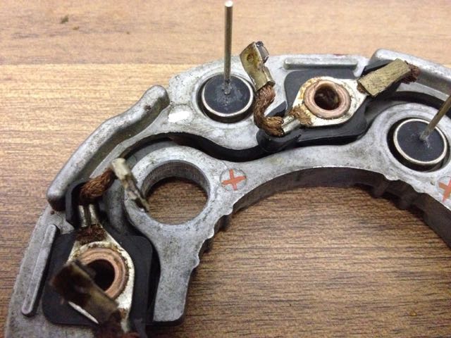 Das mit den Dioden ist klar, die habe ich am Lager, aber normal tausche ich immer ganze neue Platten ein, diese mit den kleinen elektronsichen Dioden. Da hab ich auch noch welche hier. bei den alten Dioden ist nur das Problem, wennn man die Pole weich anlötet, dass das im Zweifel mal so heiß werden kann, dass die Lötung aufmcht. Man muss das irgendwie vercrimpen zusätzlich.