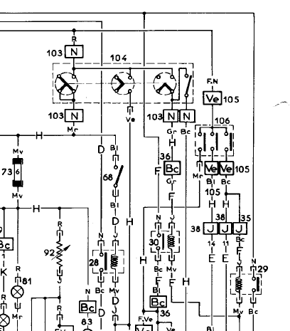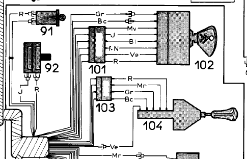 Da sah ich, dass das Kabel des Kabelbaums, das in den schwarzen Stecker Nr.103 N = Noir geht, und von dort in das rote Kabel R des Lichtschalters Nr.104 übergeht (R = Rouge, siehe Bild des Schaltschemas) eine spröde Isolierung hatte! Schaut Euch das bei Euch auch mal gelegentlich an. (leider habe ich kein Foto gemacht).