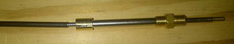Dann wird eine Hülse gedreht, die sich sowohl an den Röhrchen als am Bowdenzug abstützt. Zusätzlich wird sie jeweils ca.5mm aufgeschoben und stellt so den Knickschutz sicher. Damit die Hülse nachträglich eingebaut werden kann, muss sie geschlitzt sein.