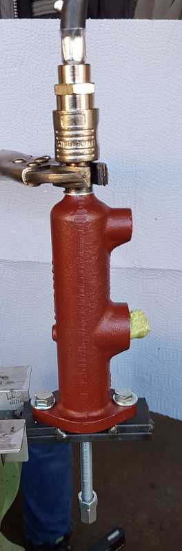 Den Geberzylinder nun vertikal im Schraubstock eingespannt kam nun (federgetrieben) langsam der Kolben zum Vorschein.